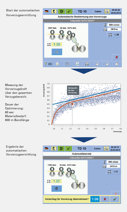 Auf Knopfdruck wird die Verzugskraft über den gesamten Verzugsbereich gemessen. Sobald der Bediener den ermittelten Vorverzug auf dem Monitor quittiert, ist die Optimierung abgeschlossen.